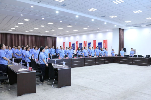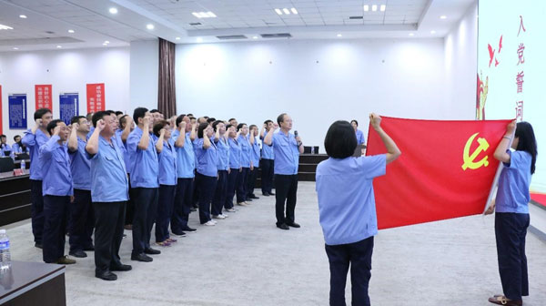 (黨支部書記、董事長王煥一領誓) “起來,不愿做奴隸的人們……”在嘹亮而莊嚴的國歌聲中,大會正式開始。“我志愿加入中國共產黨,擁護黨的綱領,遵守黨的章程……”在公司黨支部書記、董事長王煥一領誓下,全體黨員重溫入黨誓詞,堅定有力的聲音響徹全場。